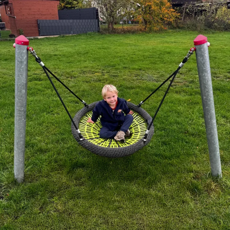 Huck huskestativ Mini-M med mini fugleredehuske er en plassbesparende huskeløsning utviklet for barnehager og småbarnstilpassede lekeplasser. Den runde sitteflaten gir stabile bevegelser og en trygg huskeopplevelse, og egner seg godt for rolig lek og gradvis tilvenning. Lav opphengshøyde og en solid stålkonstruksjon gjør stativet velegnet for utendørs bruk for barn fra 2 år. Stativet leveres med mini fugleredehuske som gir god støtte og komfort under bruk.