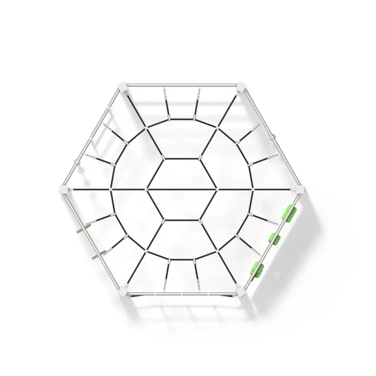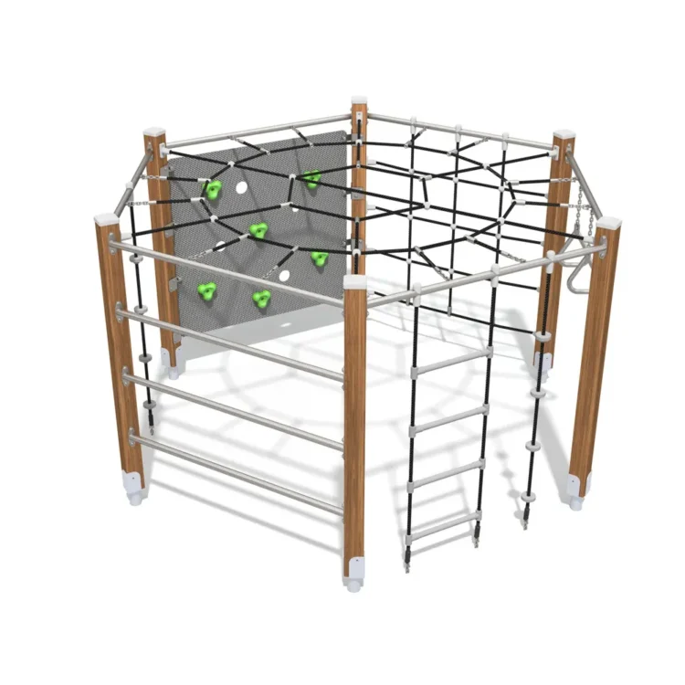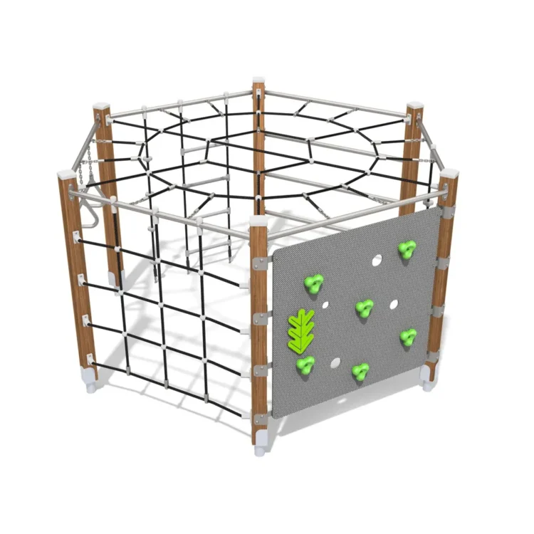 Et kompakt klatreelement med sekskantet form som åpner for lek fra alle sider. Den gjennomgående konstruksjonen gir barna mulighet til å bevege seg fritt mellom ulike klatreutfordringer, og skaper et naturlig samlingspunkt for aktiv lek.