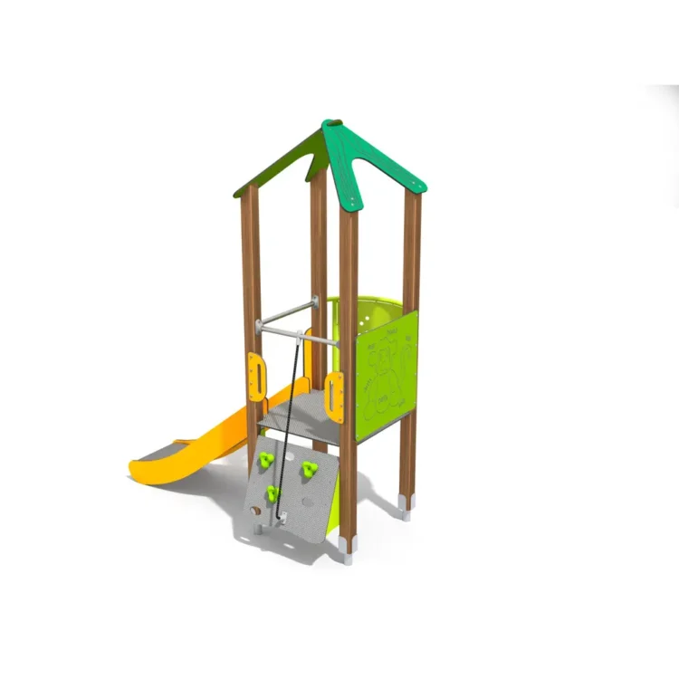 Den overdekkede plattformen fungerer som et naturlig stoppunkt i leken og gir rom for både utsikt og samspill. Løsningen passer godt i barnehager og mindre lekeområder der man ønsker et kompakt apparat med tydelig aktivitet for barn i alderen 3–12 år.