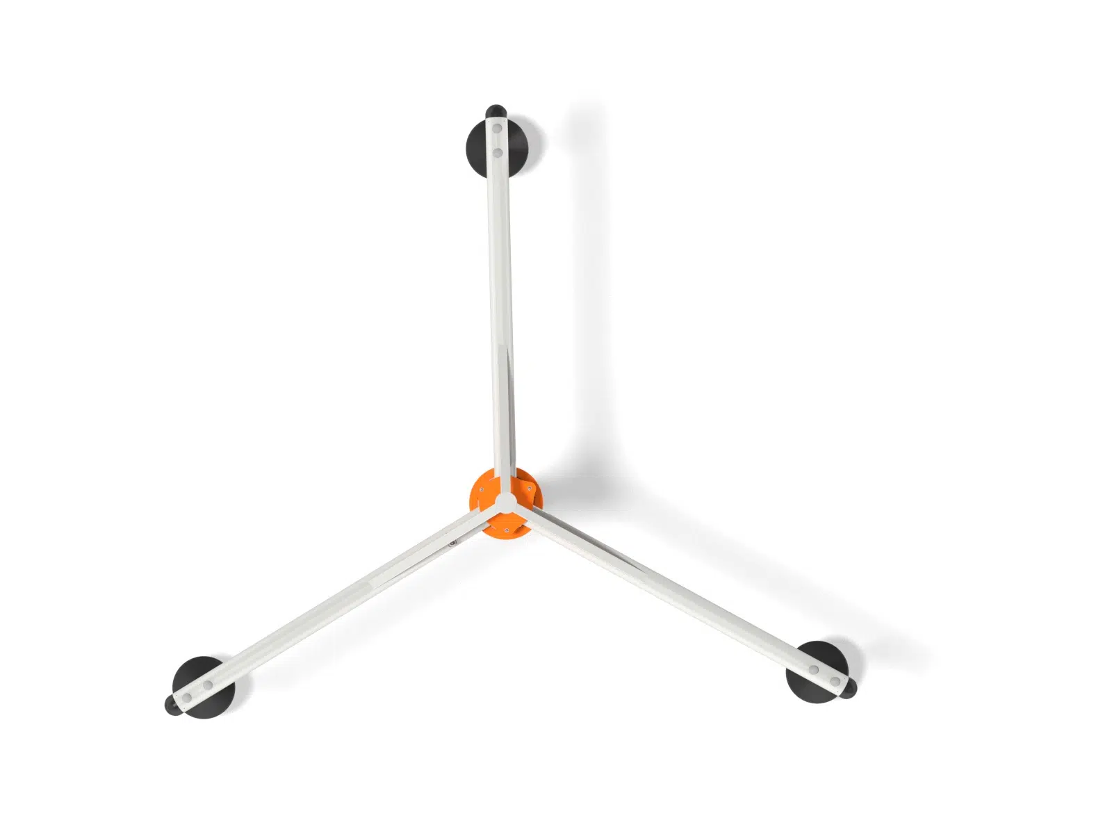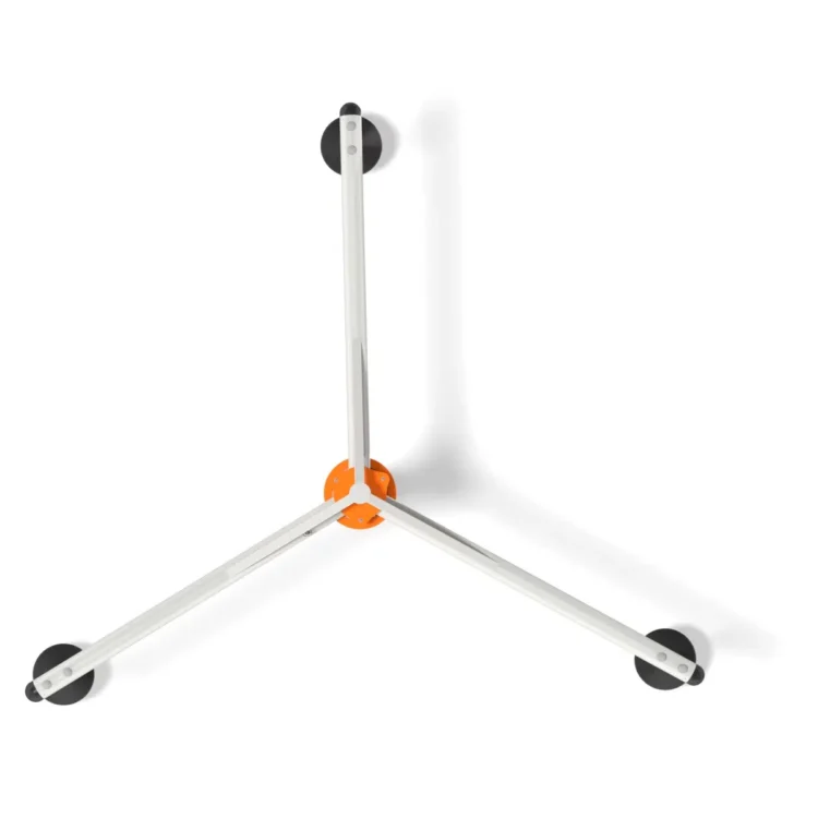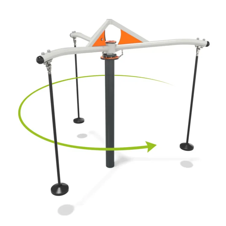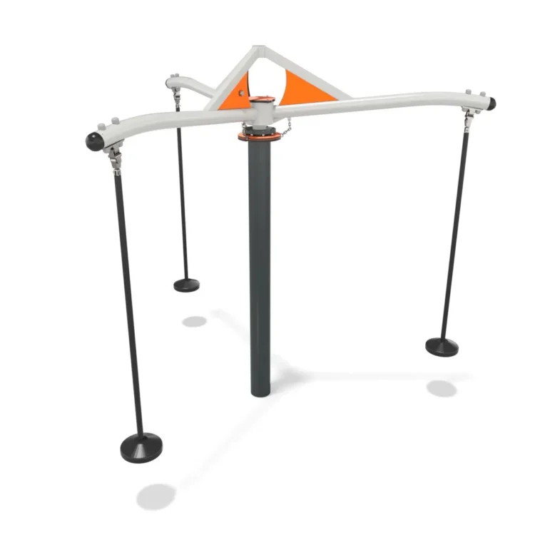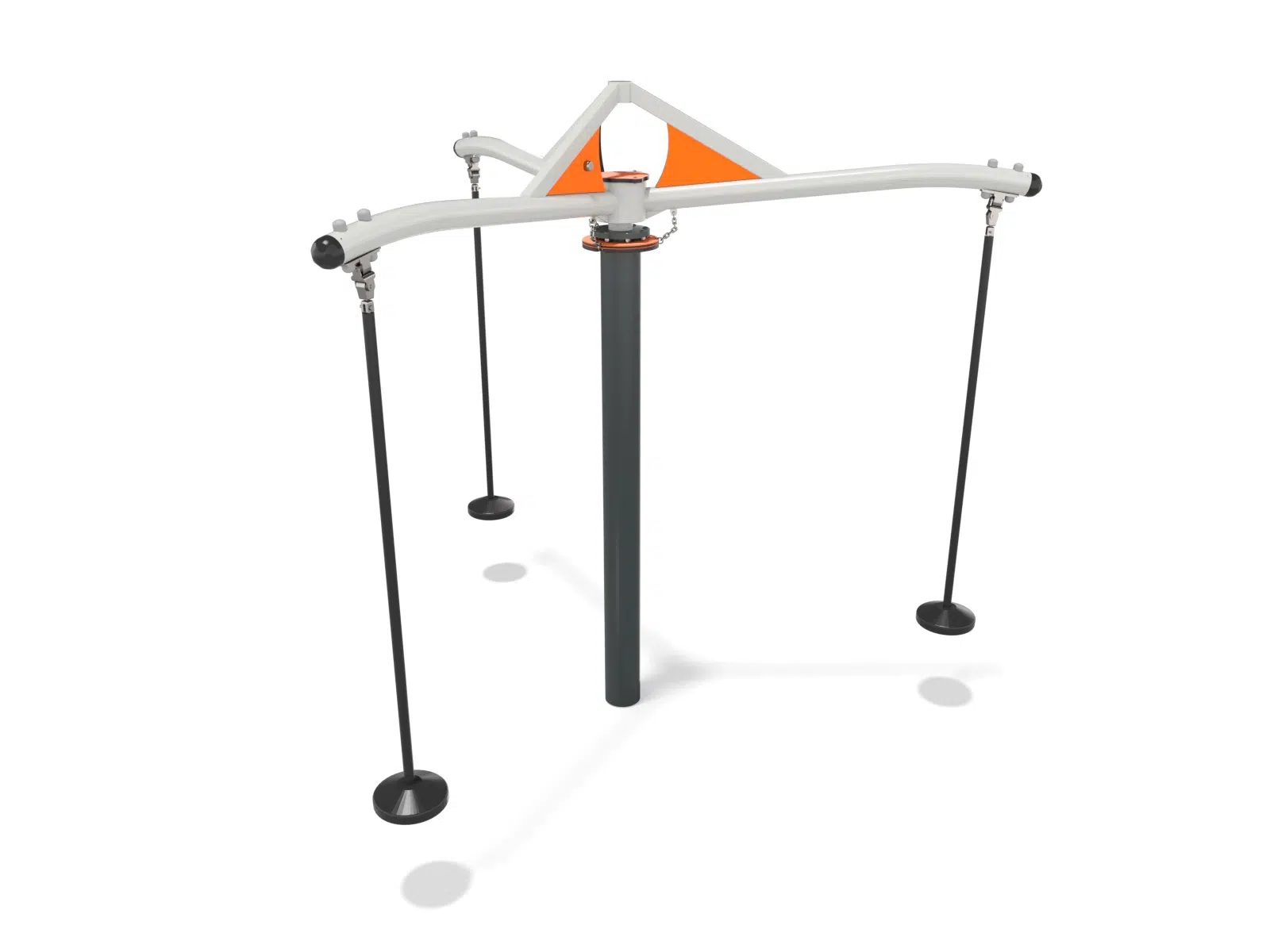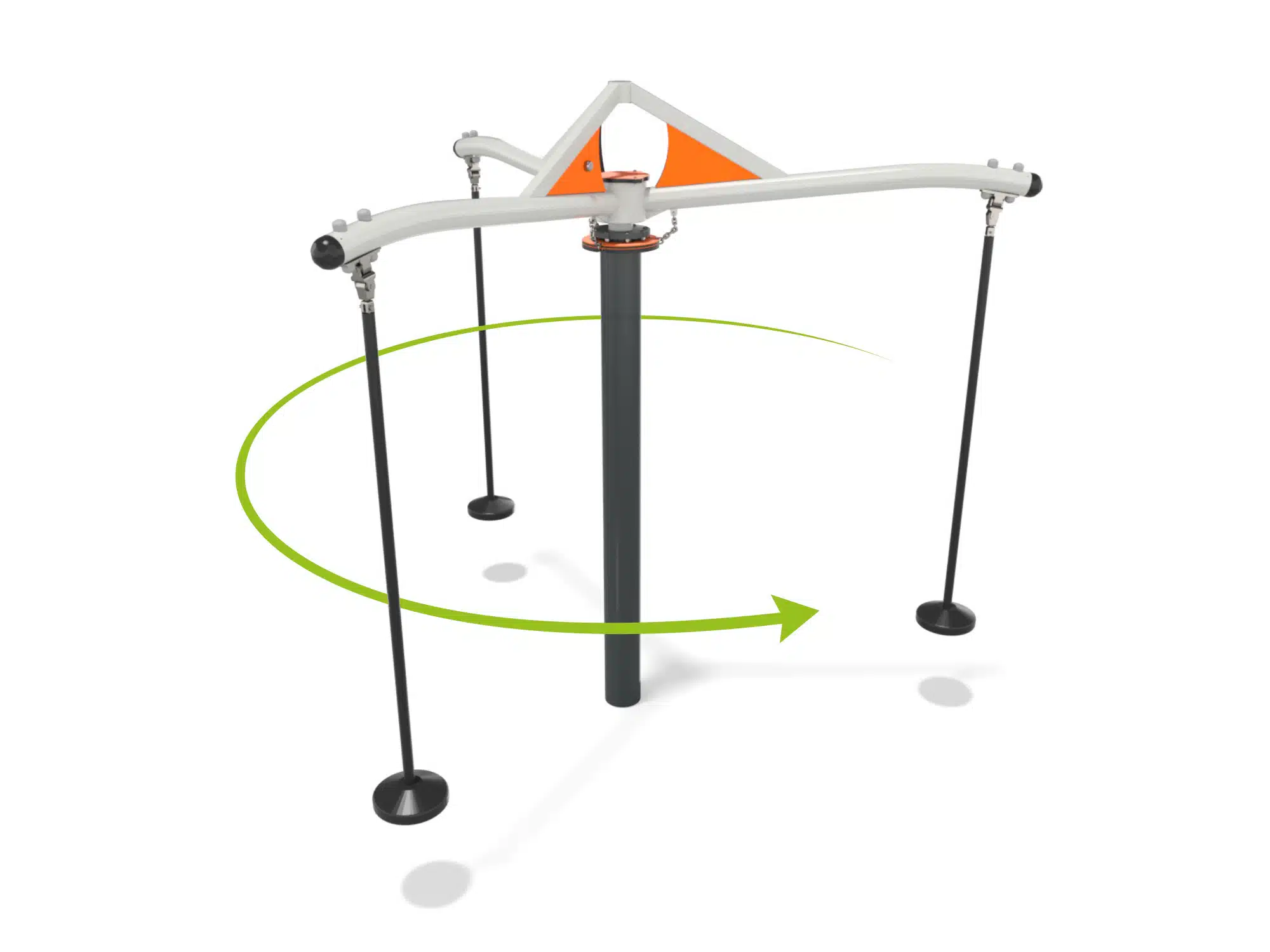 Karusell i stål med tre armer med pendelseter. Karusellen snurrer rundt.